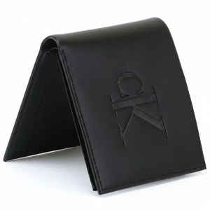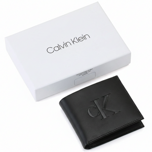 محفظة رجالية من كالفن كلاين، مصنوعة من الجلد الأسود، ثنائية الطي، مزينة بشعار CK معدني كبير.