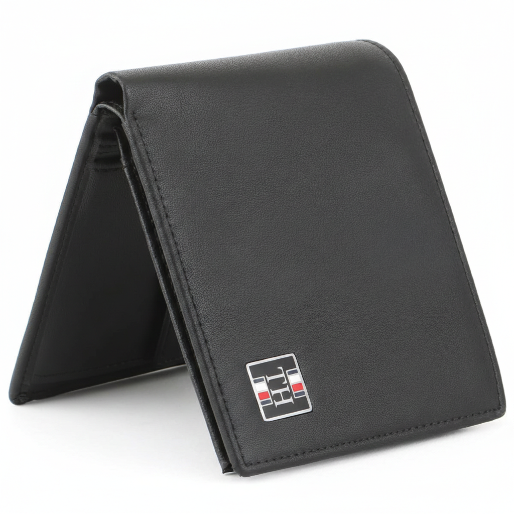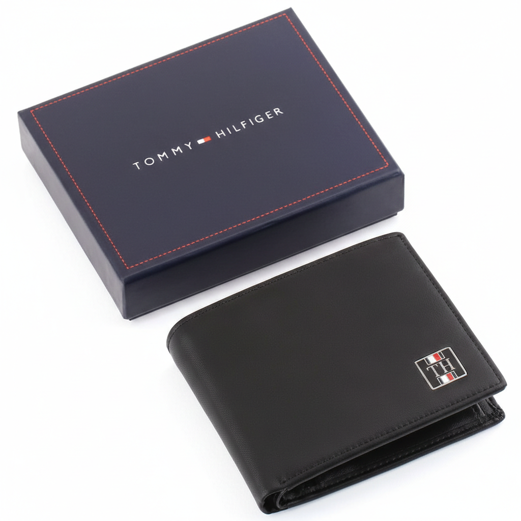 | Wallet-features | Card organization, Compact design, Mirror original, Tommy Hilfiger, Organized interior with multiple card slots and bill compartment, Internal coin pocket with secure button closure, Signature red, white, and blue fabric logo patch on front, Premium black Saffiano leather (scratch-resistant texture), Authentic Tommy Hilfiger designer bifold wallet |