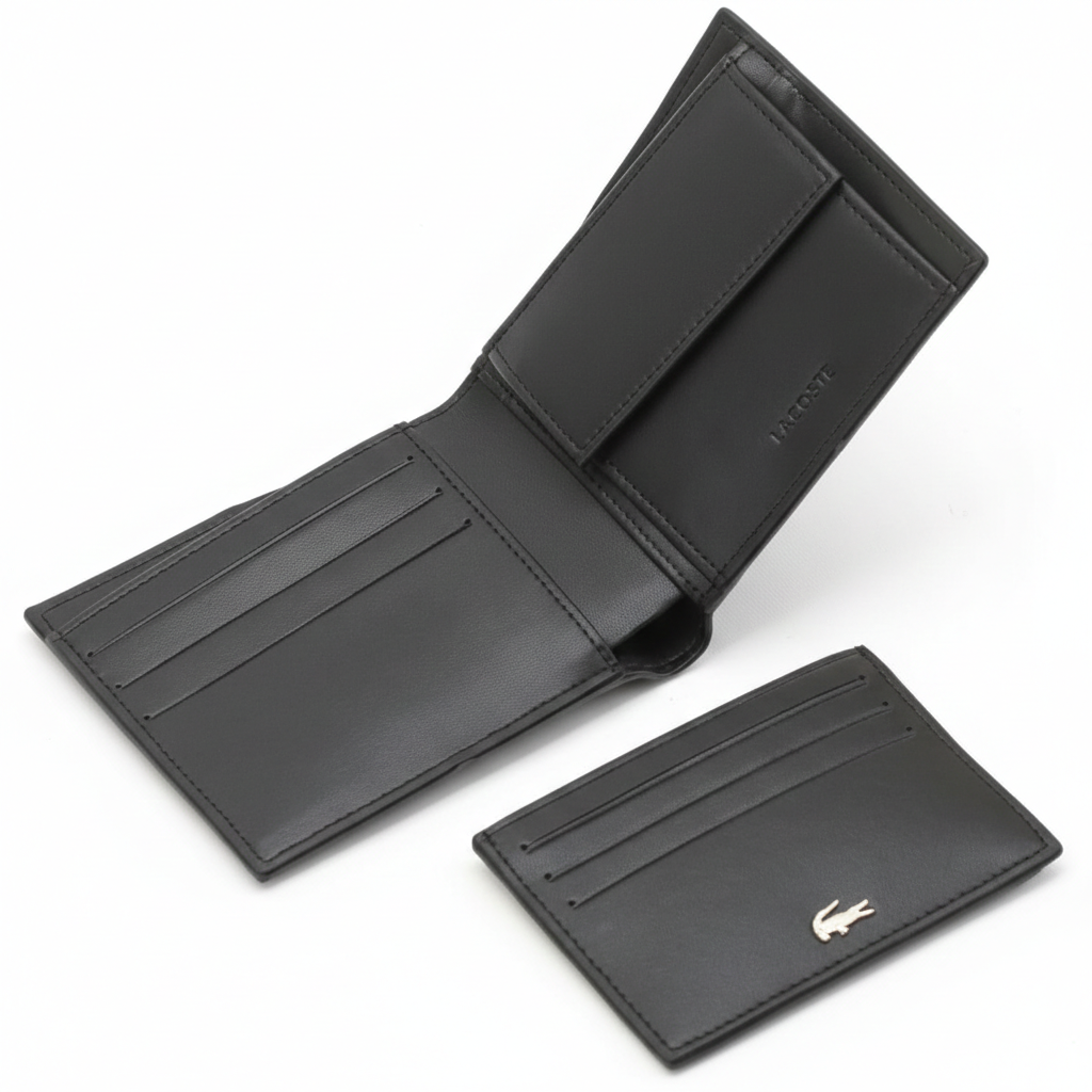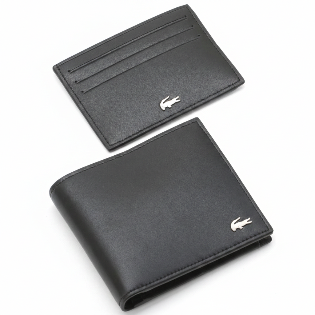 ارتقِ بإطلالتك مع طقم هدايا لاكوست الرجالي الفاخر باللون الأسود الكلاسيكي. مصنوع من جلد ناعم عالي الجودة، يتضمن هذا الطقم الأنيق محفظة ثنائية الطي أنيقة وحامل بطاقات رفيع متناسق لتنظيم مثالي. يزدان كلا القطعتين بشعار لاكوست الشهير على شكل تمساح فضي معدني، مما يضفي لمسة عصرية راقية. سواء استخدمتما معًا أو بشكل منفصل، يوفر هذا الطقم تنوعًا وأناقة للرجل العصري. يُقدم كطقم متكامل، مما يجعله إكسسوارًا يوميًا مميزًا أو هدية فاخرة.
