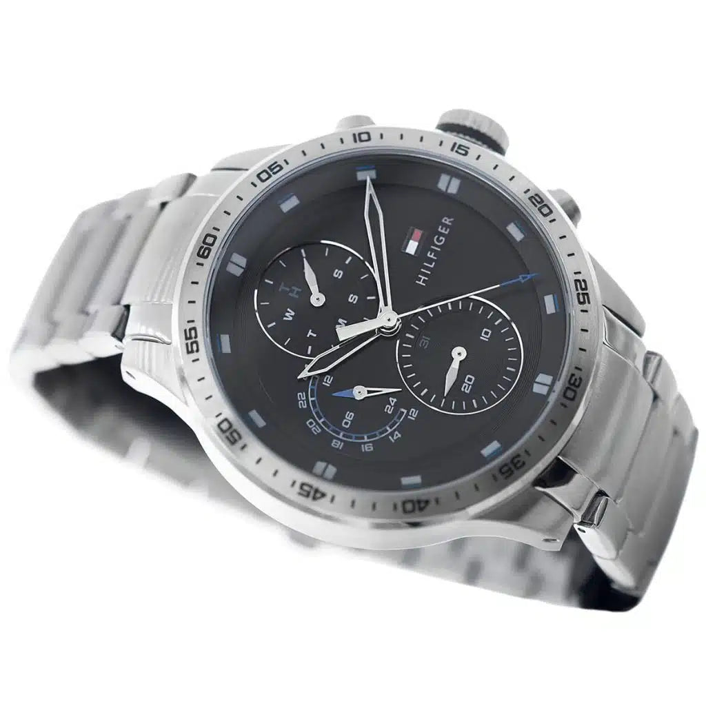 Define your style with the bold and high-performance Tommy Hilfiger Shawn 1791805. This masculine multi-function watch features a substantial 44mm silver-tone stainless steel case paired with a matching triple-link stainless steel bracelet. The deep black sunray dial is designed for precision and impact, featuring sleek silver-tone markers, luminous hands, and three functional sub-dials with subtle blue accents displaying the day, date, and 24-hour time. Built for the modern man who demands a reliable, large-profile timepiece, the Shawn collection offers a commanding aesthetic that transitions perfectly from a fast-paced workday to a stylish weekend adventure.
