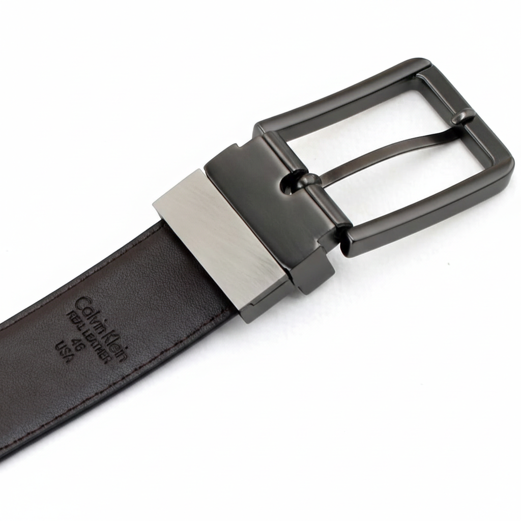 Detailed close-up of the brown side of a Calvin Klein reversible leather belt showing the embossed genuine leather stamp and polished metal pin buckle