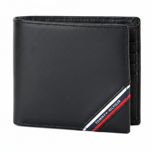 | Wallet-features | Card organization, Authentic designer bifold wallet, Premium genuine black leather construction, Iconic diagonal flag ribbon detail, Subtle silver-toned metal flag logo on back, Organized interior with multiple card slots and ID window, Tommy Hilfiger, Mirror original |