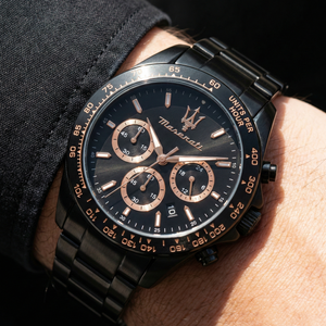 Dominate the track and the boardroom with the Maserati Traguardo R8873612048. This high-performance men's watch features a bold 45mm black ion-plated stainless steel case and a matching link bracelet. The striking black dial is accented with elegant rose gold-tone hands, markers, and the iconic Maserati Trident logo. Equipped with a precision chronograph movement and a tachymeter bezel, this timepiece reflects the racing soul of Italian engineering.