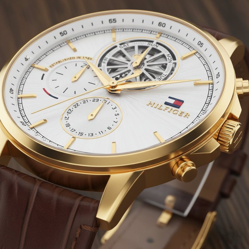 A refined timepiece blending classic design with modern detail — the Tommy Hilfiger 1710631 features a silver dial enhanced with gold-tone markers and multi-function sub-dials for day, date, and 24-hour time.