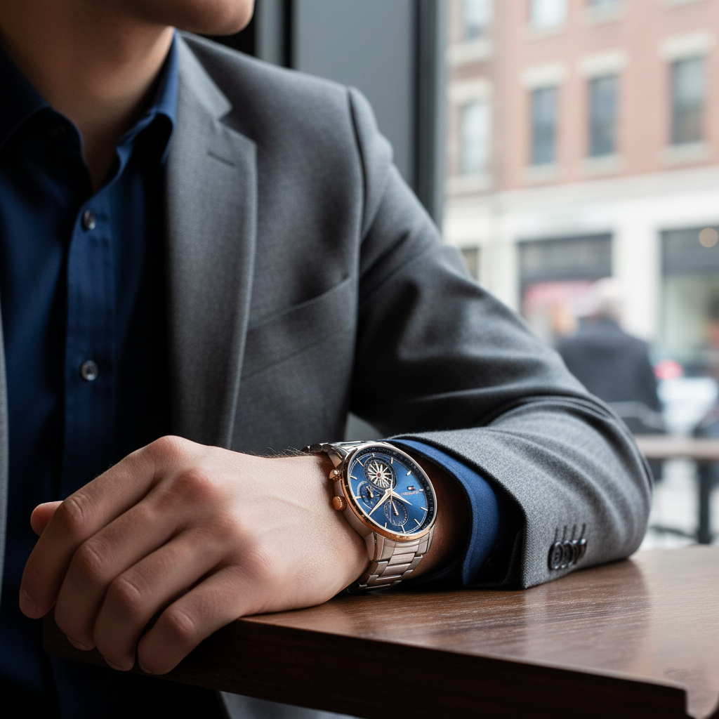 The combination of rose gold, blue, and silver creates a premium high-end look.