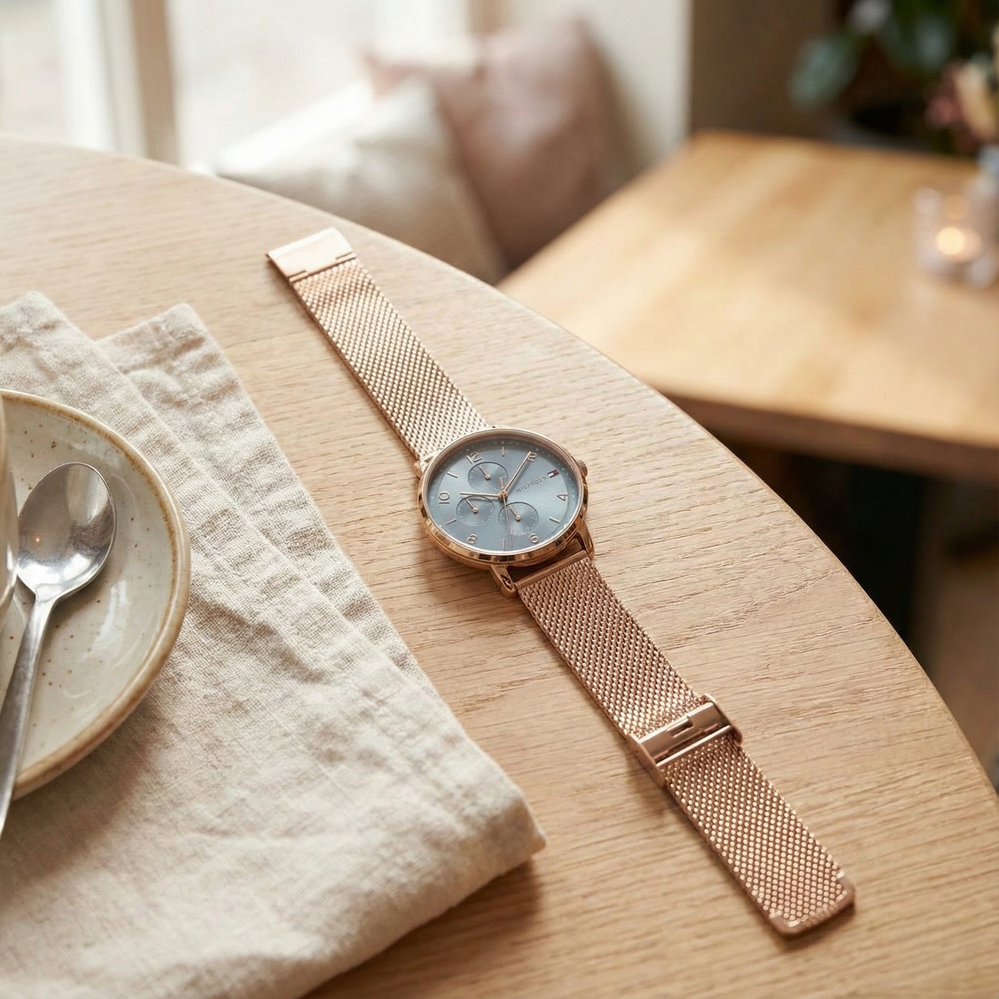 features a unique blue-grey dial paired with a luxurious rose-gold stainless-steel mesh bracelet.