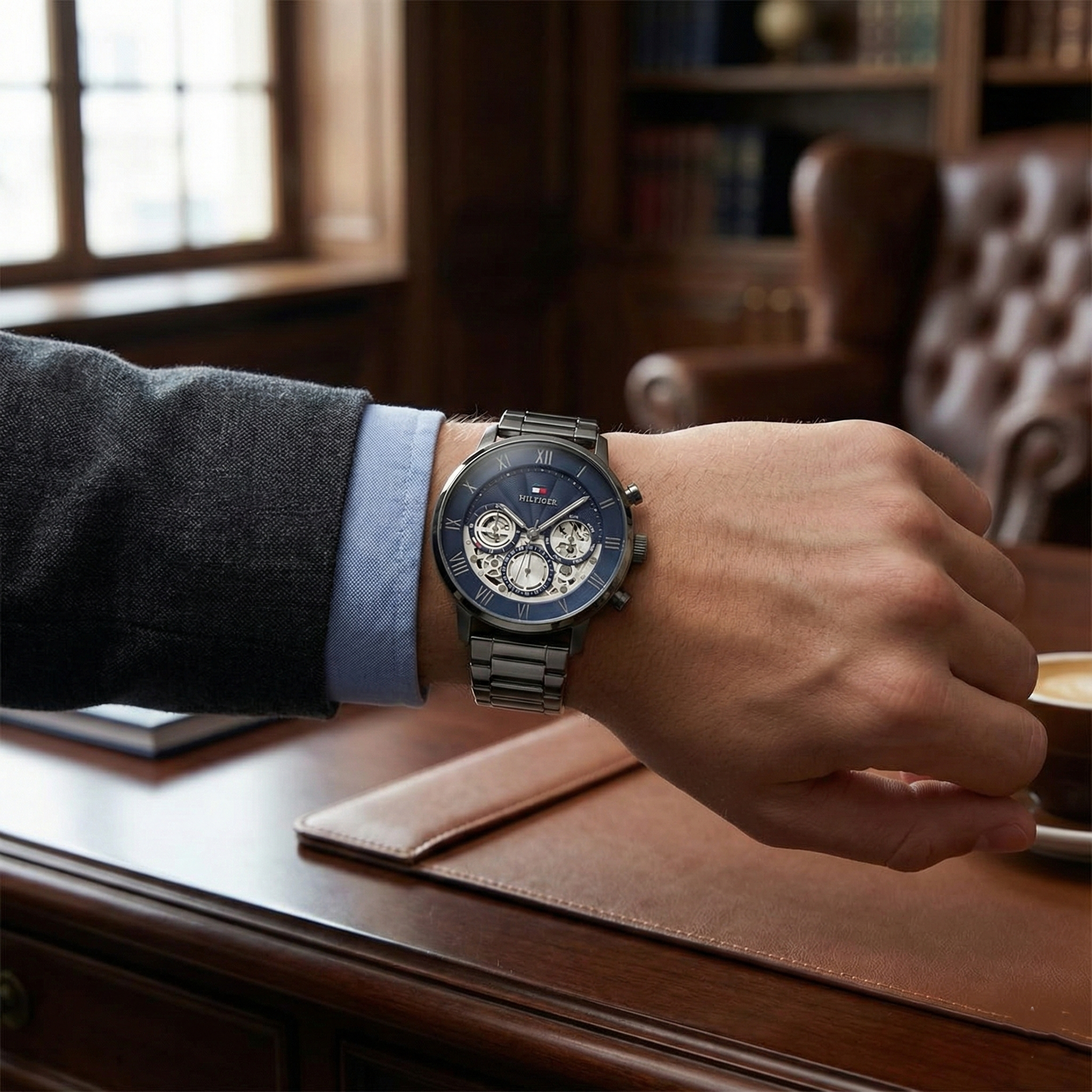 Tommy Hilfiger 1710569 Men’s Multi-Function Watch – Blue Skeleton Dial & Gunmetal Stainless-Steel Bracelet