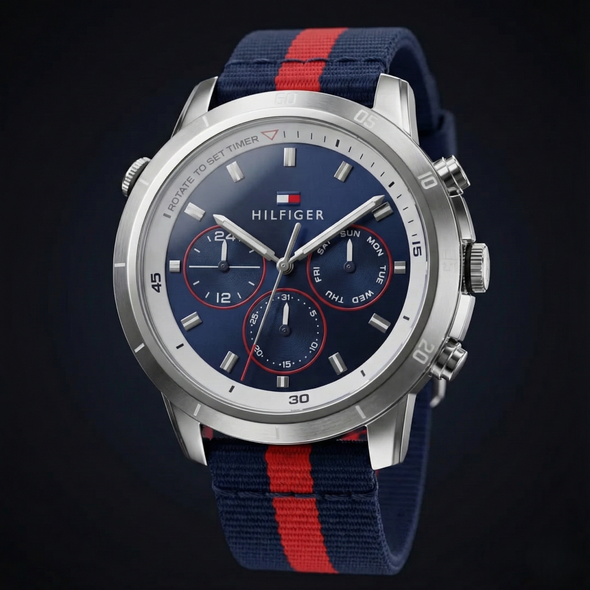 Featuring a deep blue dial, stainless-steel case, and a sporty navy-red fabric strap, this watch offers durability, comfort, and signature Hilfiger elegance.