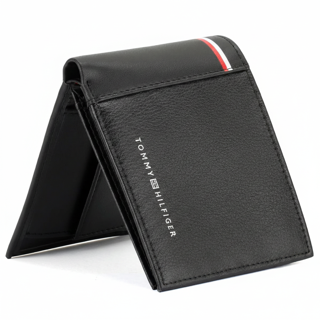 Tommy Hilfiger Men's Wallet | Black Pebbled & Smooth Leather Vertical Strip with Coin Pocket