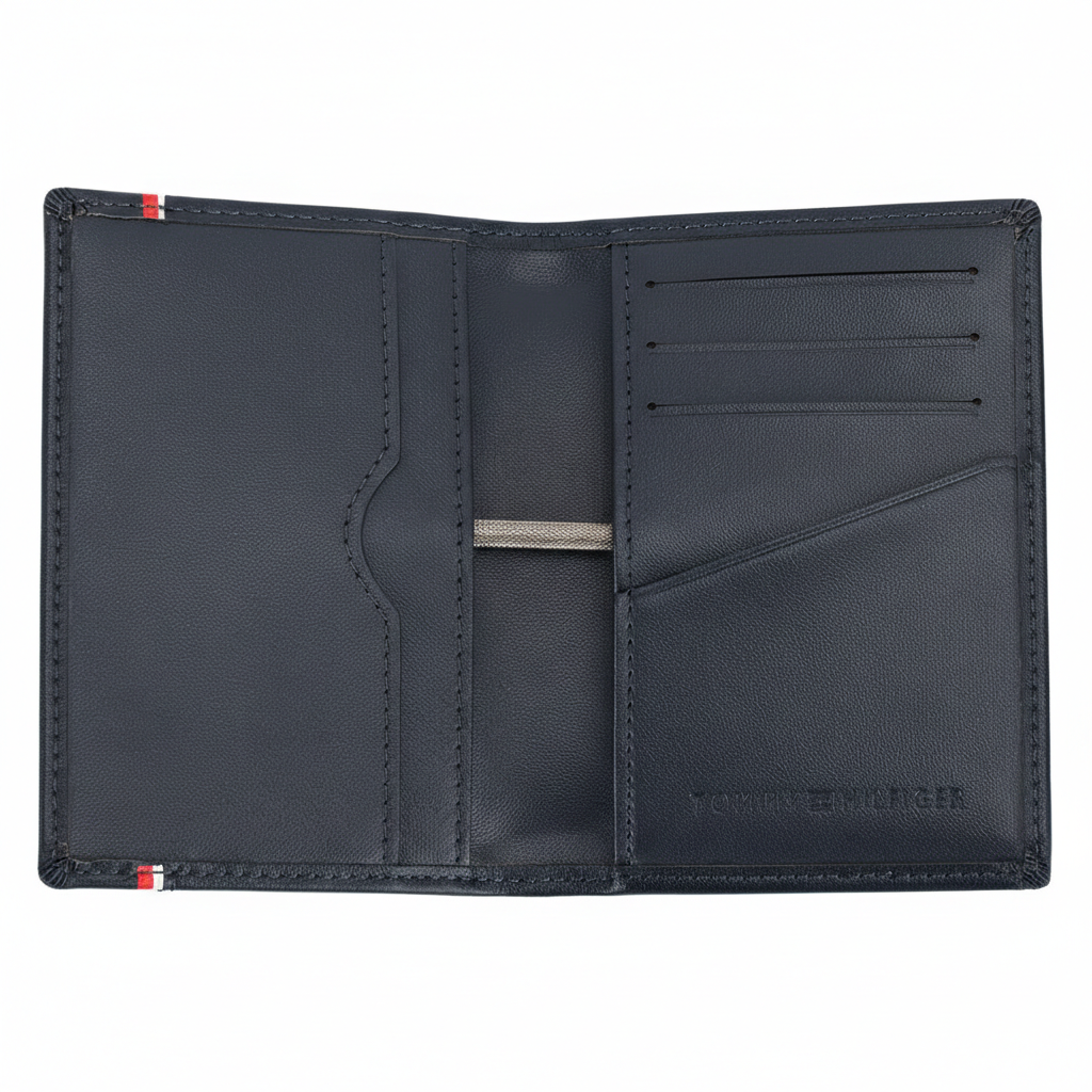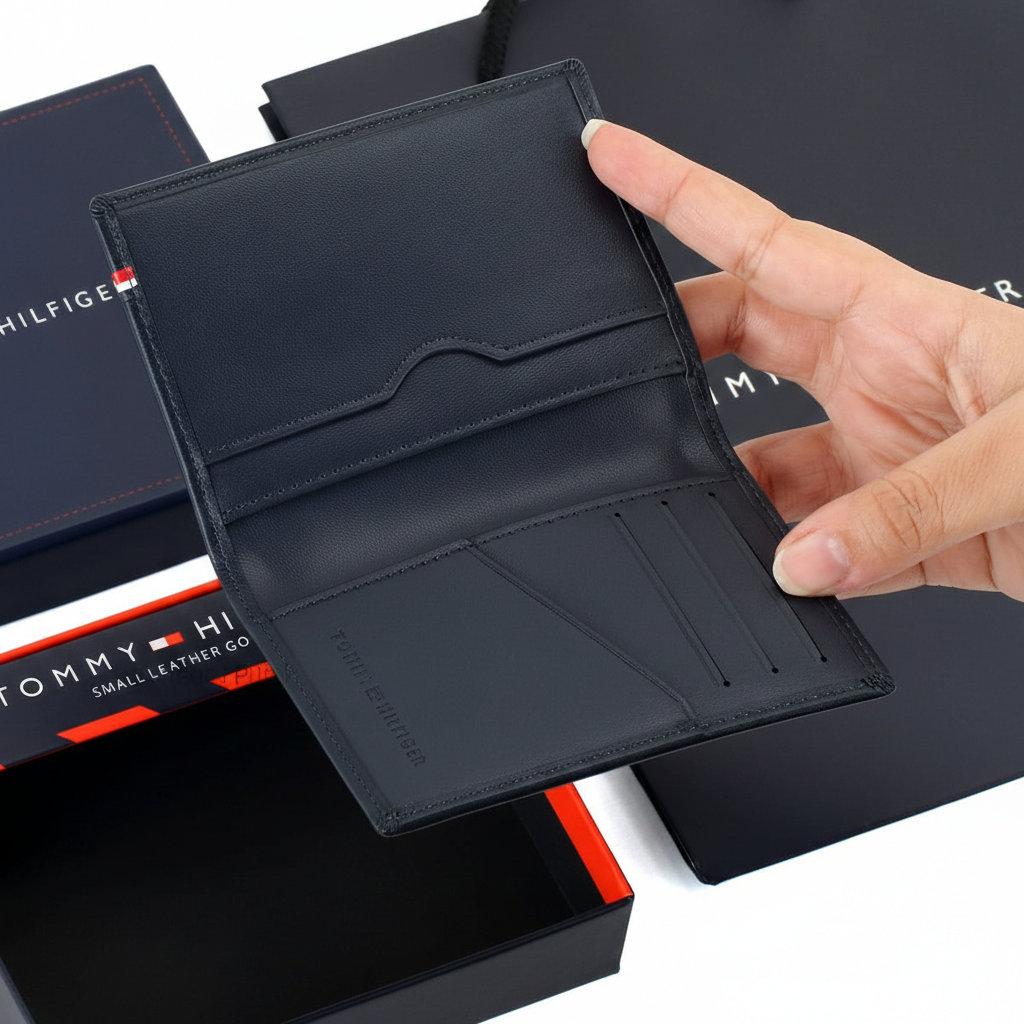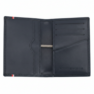 | Wallet-features | Card organization, Compact design, Premium navy blue genuine leather construction, Sleek bifold card case design, Raised silver-toned Tommy Hilfiger metal logo, Iconic horizontal flag stripe detail, Organized interior with multiple card slots and ID window, Organized interior with multiple card slots, Tommy Hilfiger, Mirror original |